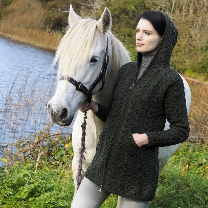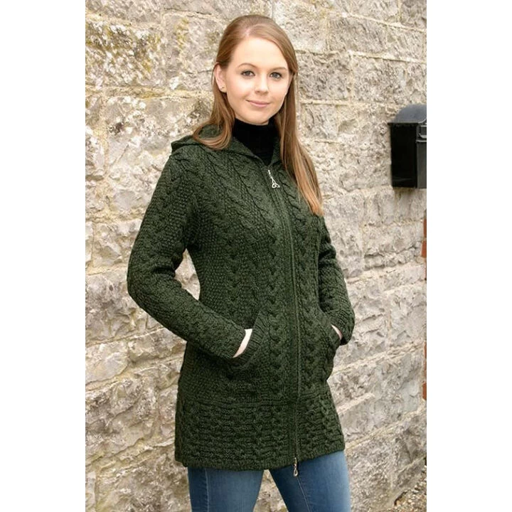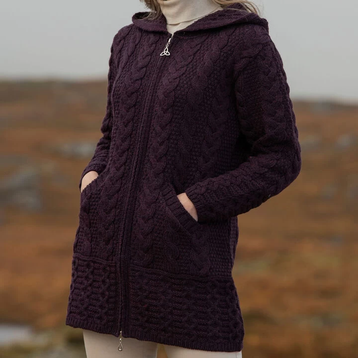 Aran Crafts® Women’s Long Hooded Celtic Knot Zip Front three quarter length, Irish double zip knitted cardigan has a hood and insert pockets that make it practical, cozy and very wearable – a must have. The Celtic knot design on the zip puller is an attractive feature. The ladder stitching between the Irish cables signifies various stages of life. The various size and direction of the Irish cabling is very slimming for the wearer.