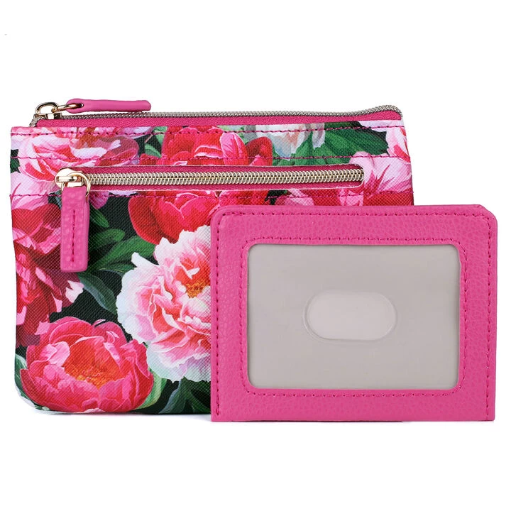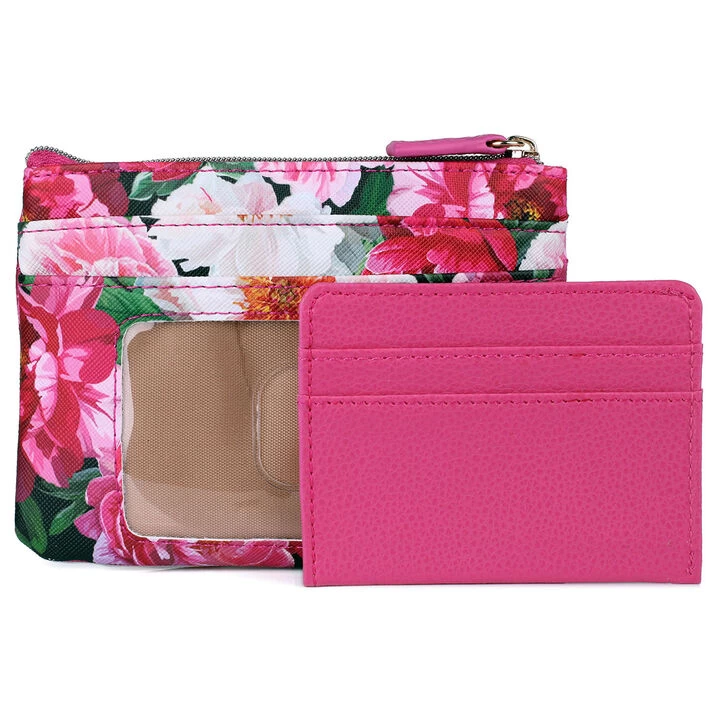 Buxton® Floral Bloom Printed Vegan Leather with RFID blocking lining Pik-Me-Up ID Coin / Card Case features a top zip main compartment, pull-out ID window with 2 credit card slots, front zipper pocket and back ID window and slip pocket.
