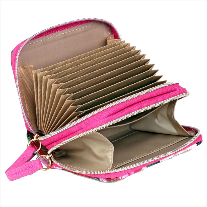 Buxton® Fuchsia Floral Blooms printed Vegan Leather with RFID blocking lining and Gold tone hardware Pebble Pik-Me-Up® Wizard Wallet features an outside ID window, full zipper section with 9 accordion credit card pockets and 2 utility pockets, and a gusset zipper back section with 2 utility pockets.