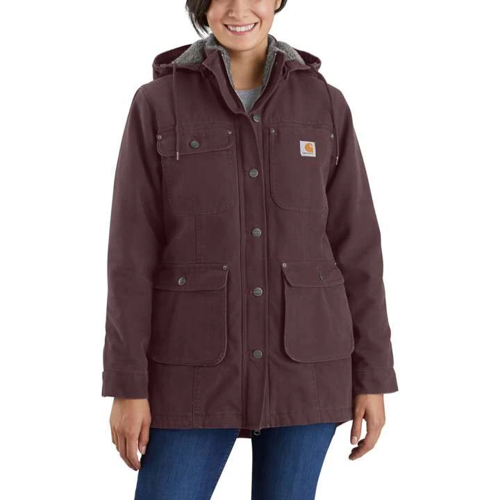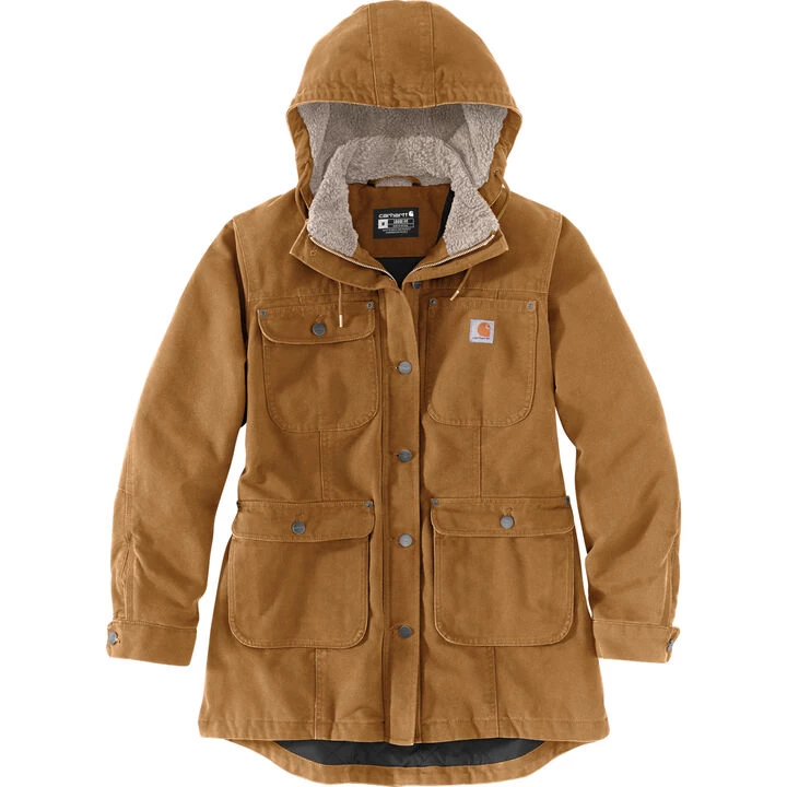 When the work won’t wait for warmer weather, zip into this Carhartt® Women’s Loose Fit Washed Duck weathered Coat. Arctic-weight insulation and Sherpa-lined collar keep you warm in the barn or at the job site. The Loose Fit layers well over pullovers and heavy sweaters through the winter, and a quilted Nylon lining makes for easy on and off. Wear it with or without the hood.