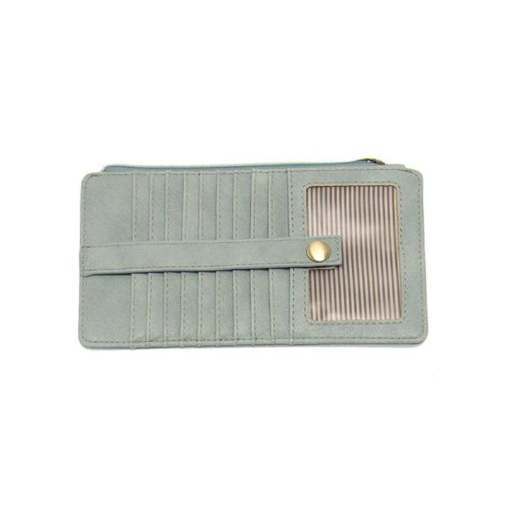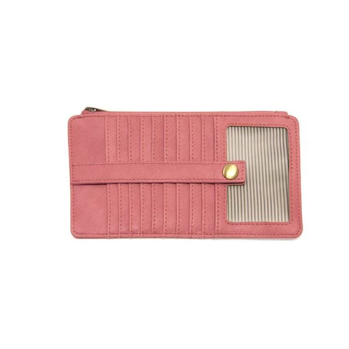 Joy Susan® Women’s Kara Distressed slim and sleek card wallet has 9 credit card pockets, an ID window, zippered change pocket and zippered billfold pocket all in casual distressed Vegan Leather available in a kaleidoscope of beautiful colors.