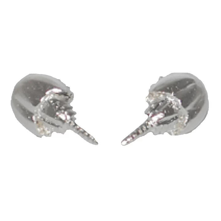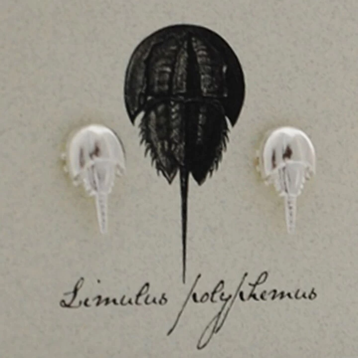 Sterling Silver Horseshoe Crab earrings mounted on Semaki & Bird, Ltd.® exclusive foldover Natural History cards.