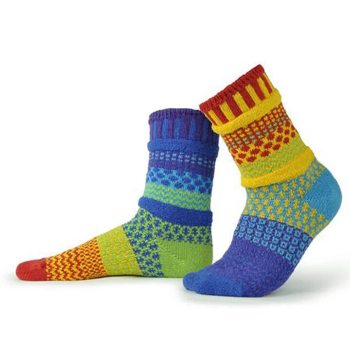 Show off your true colors in these loud-and-proud rainbow socks. No matter where you celebrate, the important thing is that you do. Beautiful socks made from repurposed cotton yarns, Solmate Socks™ offer a bundle of mismatched joy. Intentionally designed with mismatched colors and prints, colors in this sock are Red, Purple, Gold, Royal Blue, Light Blue and Lime Green.
