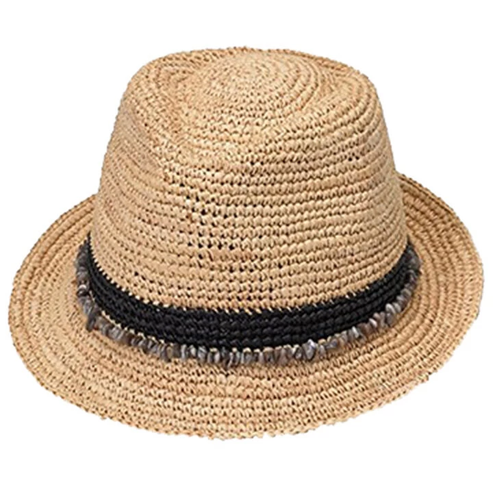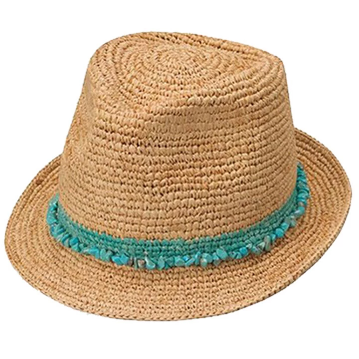 Wallaroo® Women’s Tahiti short brim sun hat can be worn anywhere your travels take you. Accented with a color-dyed band and matching stones.