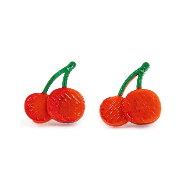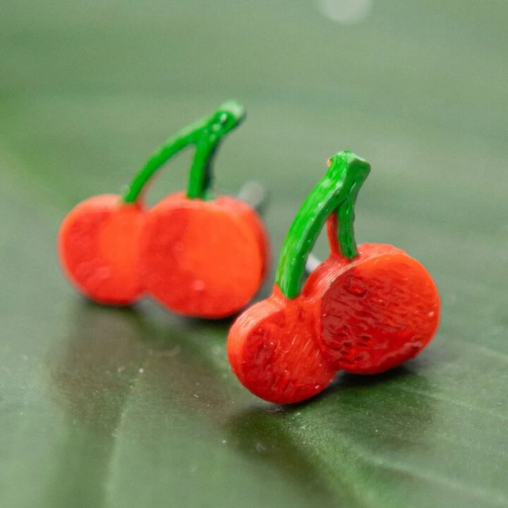 Cherry Studs! These little guys are 3D printed in a plant-based plastic and hand-painted. The stud backings are a hypoallergenic stainless steel, great for people with sensitive ears.